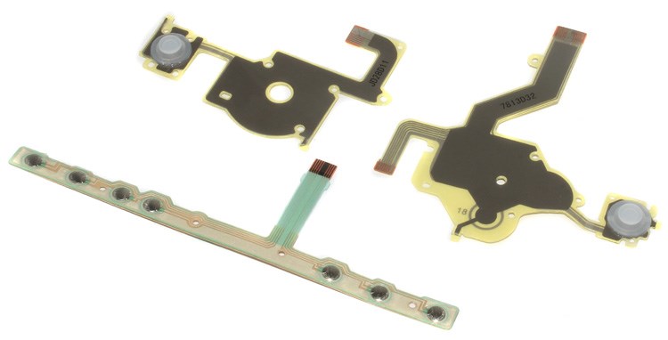 Контактные подложки для ремонта PSP серии 2000, включая 2004, 2008 и другие. Набор состоит из трёх элементов и включает в себя две предустановленные резиновые мембраны, которые являются частью подложки.