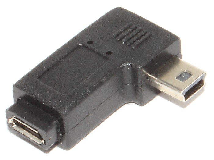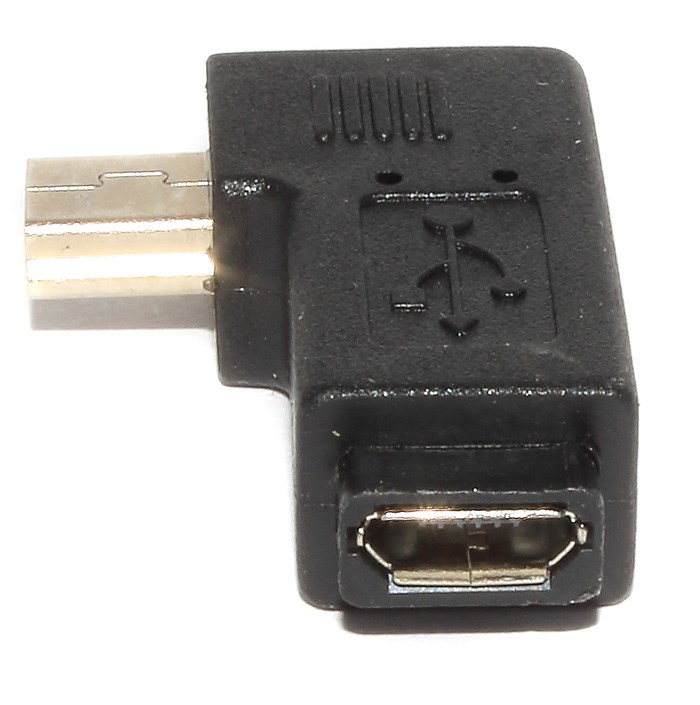 Угловой переходник Mini USB - Micro USB с поворотом влево. В переходнике распаяны все дорожки, ничто не урезано и не упрощено. Может передавать и питание, и данные.