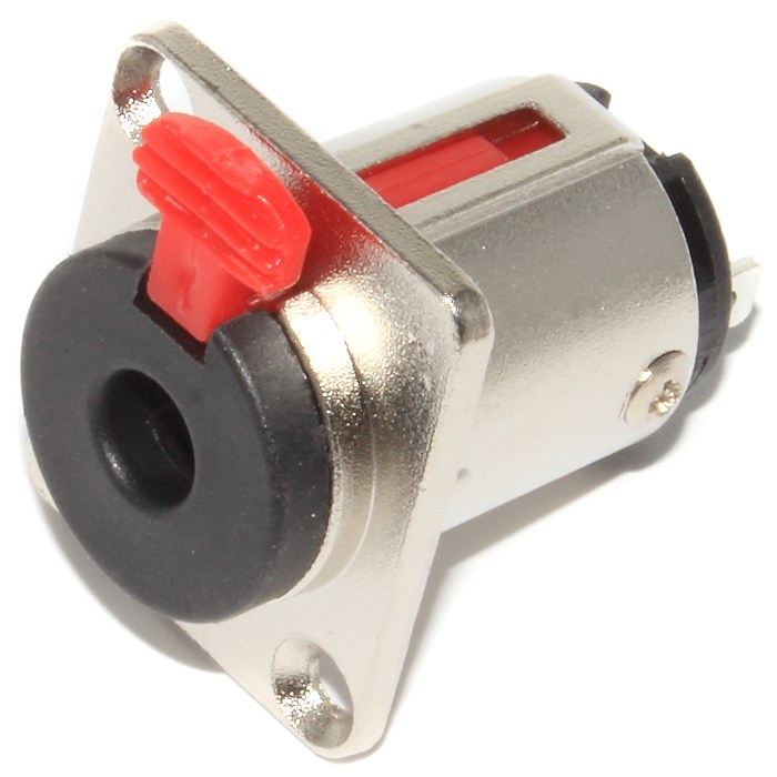 Гнездо jack 6.35 мм или т.н. "большой" Джек. Применяется в профессиональном оборудовании. Разъём оснащён фланцем с двумя отверстиями, которые используются для фиксации порта на панели комбика, микшерного пульта или любого другого оборудования.