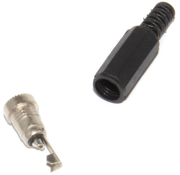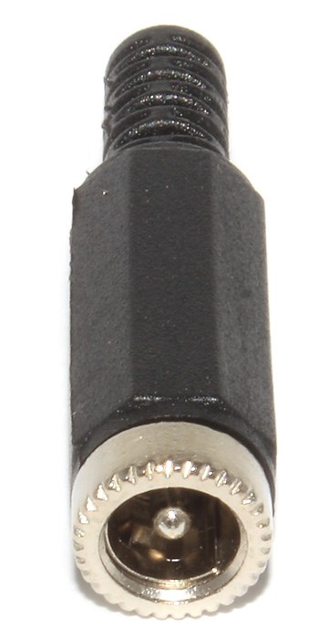 Порт питания, который нужно крепить на кабель. Параметры разъёма - 5.5 x 2.1 мм, пластиковый корпус, фиксация провода при помощи олова. Разъём разборный, внутри два вывода под пайку. При монтаже очень важно учитывать полярность - в большинстве случаев "плюс" - это центральный контакт, но далеко не всегда. Обычно параметры питания указаны на корпусе прибора.