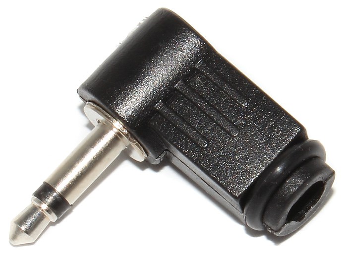 Разъём Mini Jack 3.5 мм угловой, "штекер", с углом поворота 90°. Пластиковый разборный корпус со специальным кольцом - фиксатором. У разъёма два контакта, он "моно".