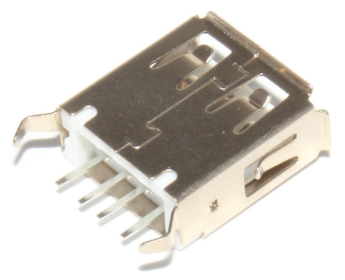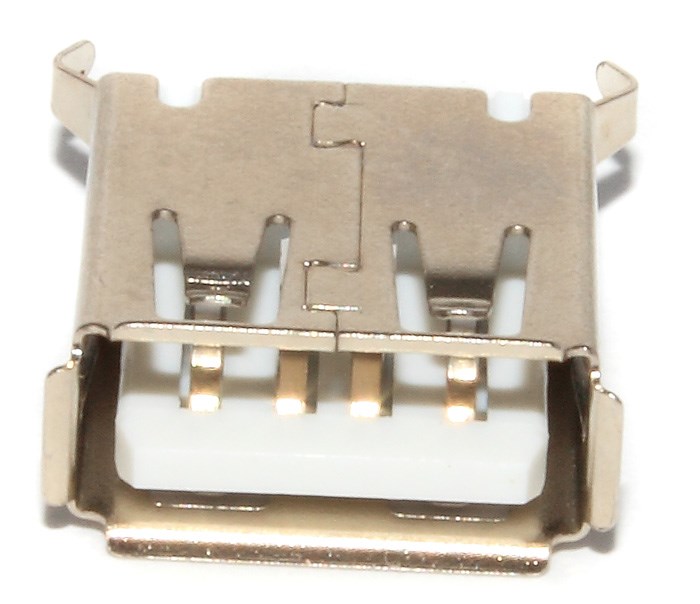 Разъём под пайку для установки на плату, USB 2.0. Четыре выводных контакта и две проушины, которые тоже припаиваются к плате и обеспечивают прочное крепление элемента. Классическое надёжное гнездо USB 2.0.