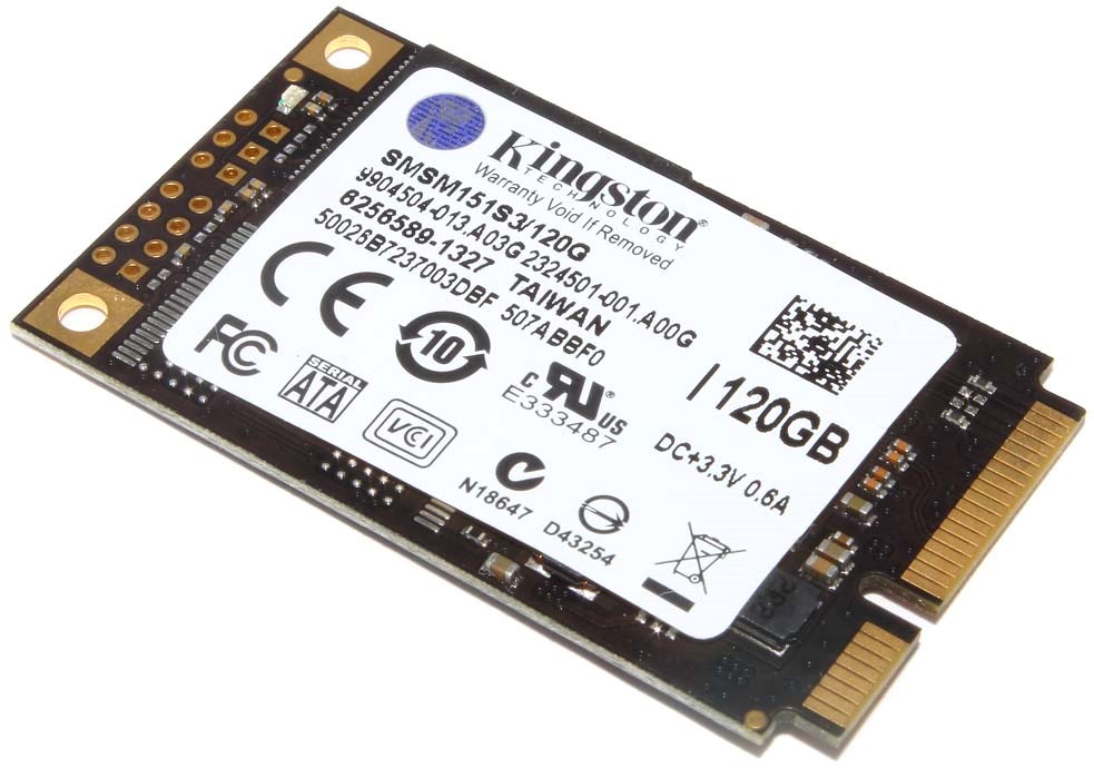 Жёсткий диск SSD с интерфейсом mSATA, объём накопителя 120 Gb, производитель Kingston, модель SMSM151S3/120G. Такие диски используются в ноутбуках с соответствующим слотом, а также устанавливаются в стационарные ПК непосредственно на материнскую плату, если у неё есть такой разъём.